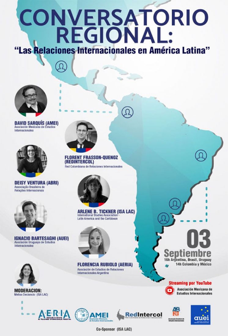 Organizan: Asociación de Estudios de Relaciones Internacionales Argentina (AERIA), Associação Brasileira de Relações Internacionais (ABRI), Red Colombiana de Relaciones Internacionales (RedIntercol), Asociación Mexicana de Estudios Internacionales (AMEI) y Asociación Uruguaya de Estudios Internacionales (AUEI)